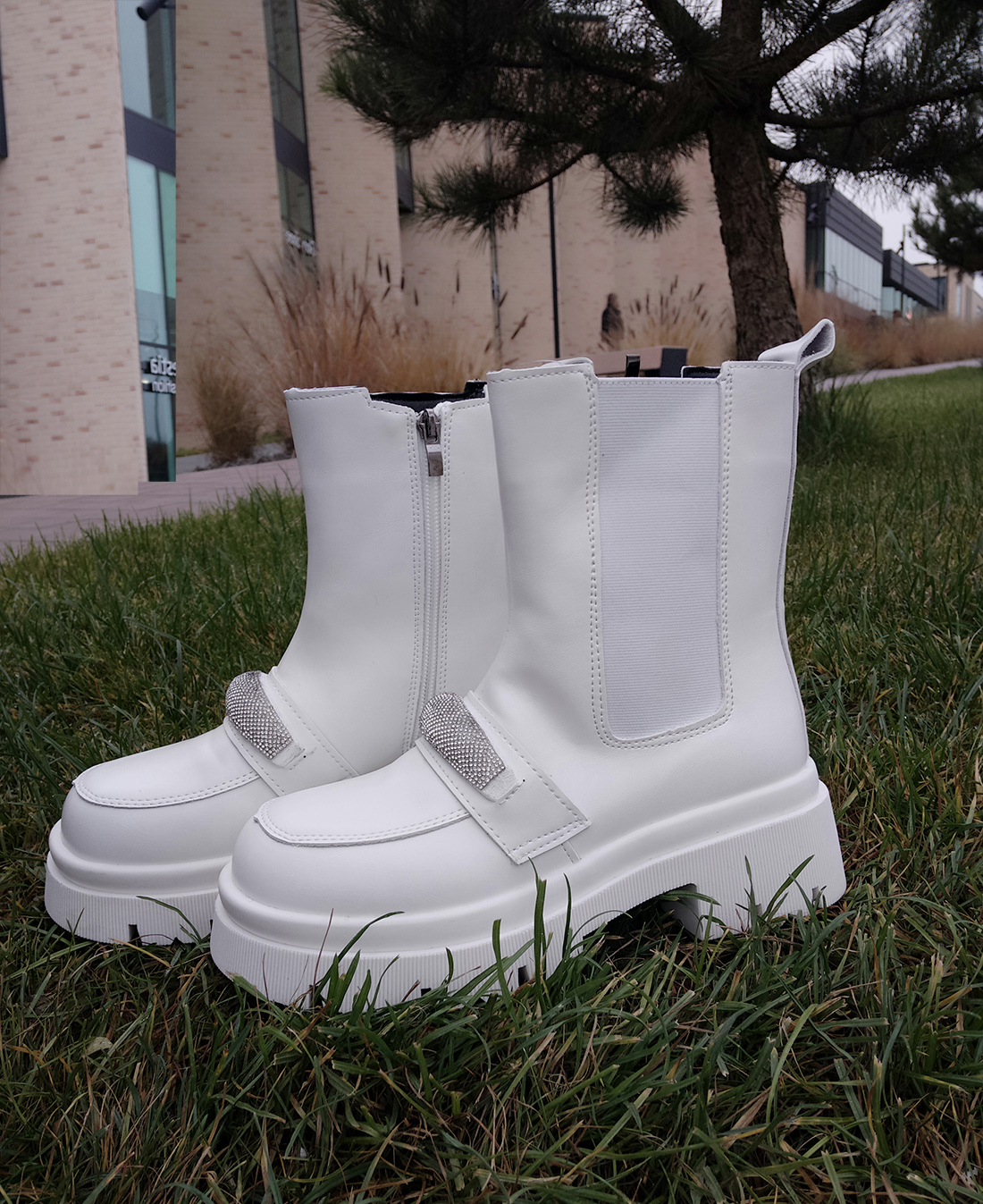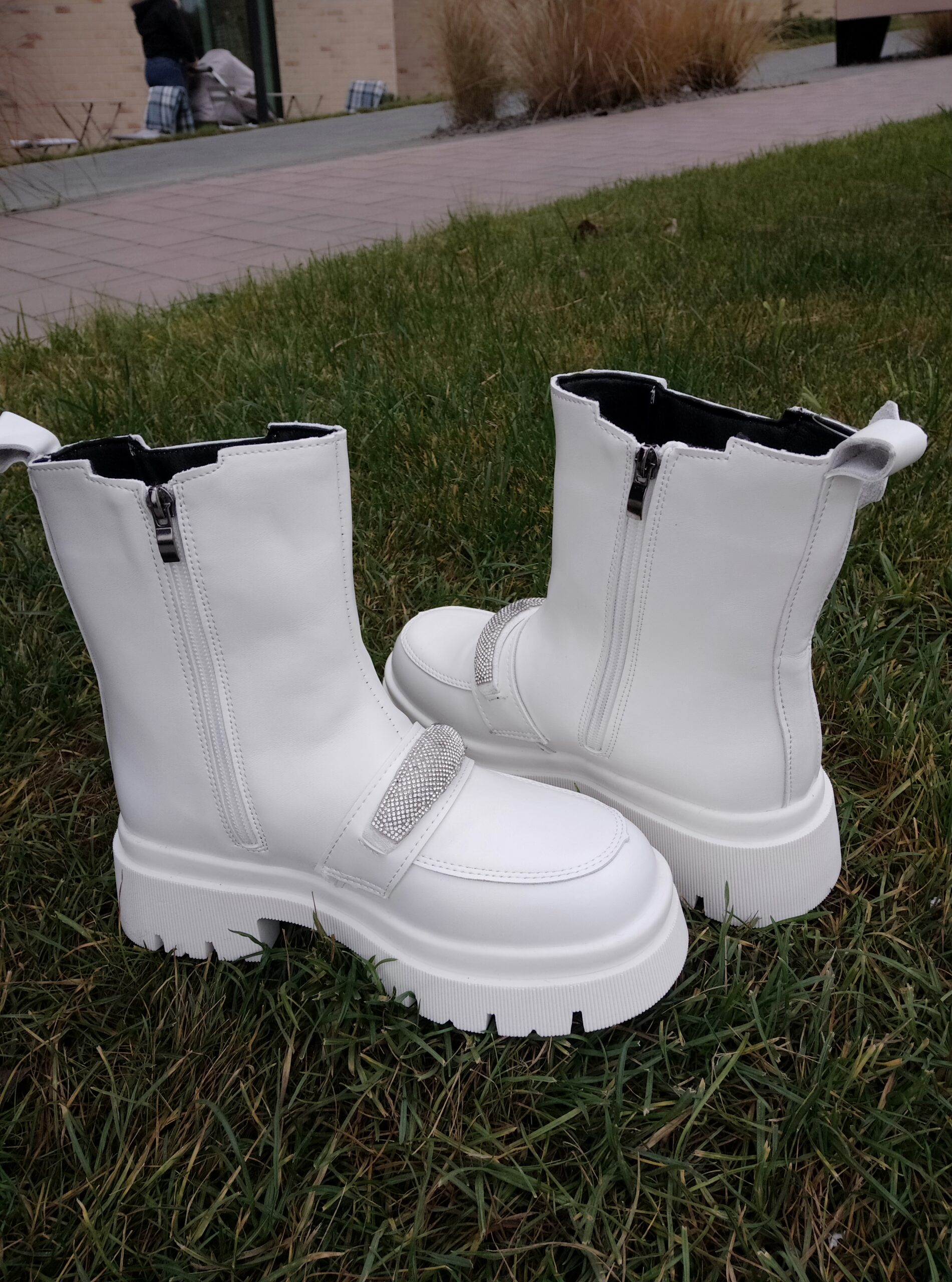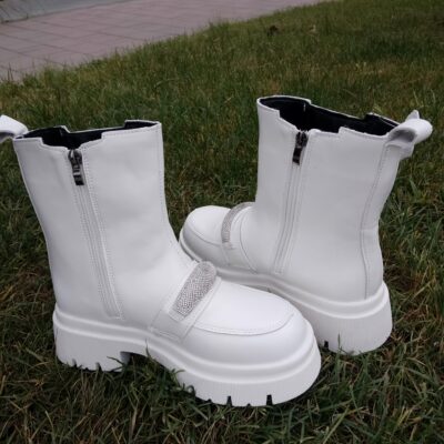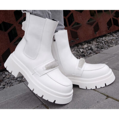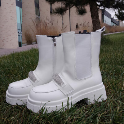 На вузьку середню ніжку .Шкіряні зимові ботинки челсі. Стильна модель білого кольору.