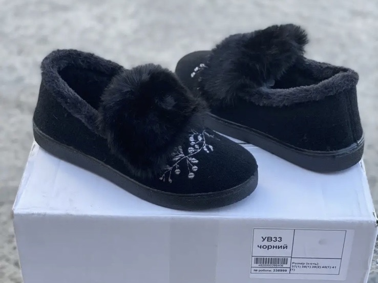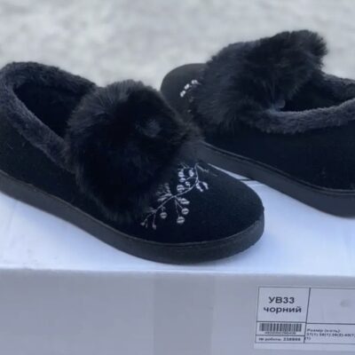 Ці затишні тапочки чорного кольору, прикрашені витонченою вишивкою та хутром, додадуть елегантності домашньому образу. М’яке хутряне оздоблення забезпечує тепло та комфорт, а міцна підошва гарантує довговічність.